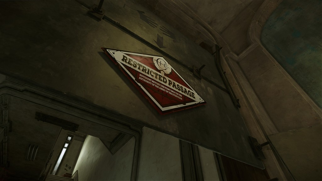 To provide a true change of pacing and invite the player to embrace the side parts circling the massive Great Hall. Museum’s Interiors were sealed with tarps setup by the Abbey. Turning a single space into a series of pieces, each bringing little situations and narrative exposition to get a glimpse on the Oracular Order and introduce the Oracular Sisters, above the Overseers in the hierarchy of the Abbey.