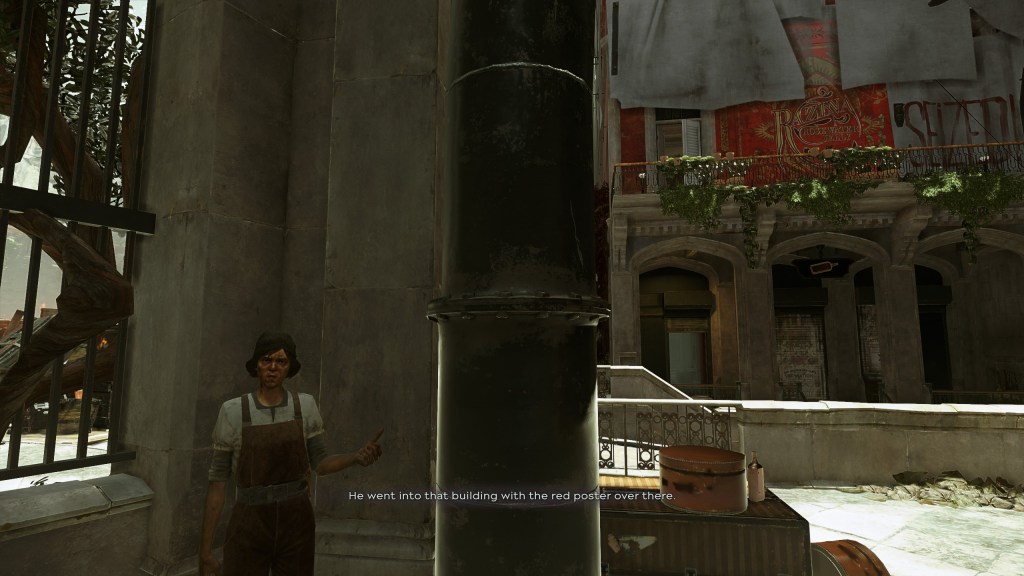That woman has no news from her husband who entered the building nearby, Player can check on him and understand what’s at stake. Leading to an encounter with Overseers that will see the Player surrounded if not fast enough.